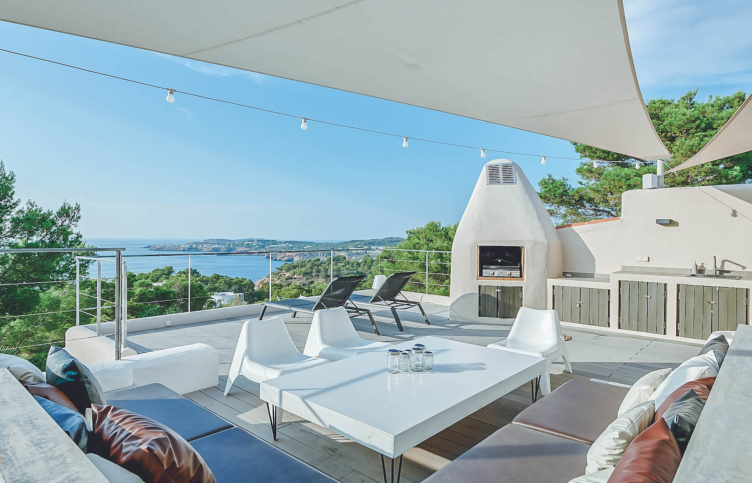Can Chloe ist eine prächtige Villa mit 5 Schlafzimmern mit beeindruckender Landschaft und weitem Meerblick, günstig gelegen, nur eine kurze Fahrt von der ruhigen und atemberaubenden Bucht Cala Vadella und der Kieselbucht Cala Moli entfernt, die zu Fuß erreichbar ist. Im Inneren des Can Chloe werden weiße Wände, Naturholz und polierte Fliesenböden mit farbenfrohen Möbeln ergänzt. Das Wohnzimmer ist ein wirklich einladender Raum neben einer großen, gut ausgestatteten Küche und einer Frühstücksbar, die sich zu einem sonnendurchfluteten Frühstückstisch öffnet, an dem acht Personen bequem Platz finden.