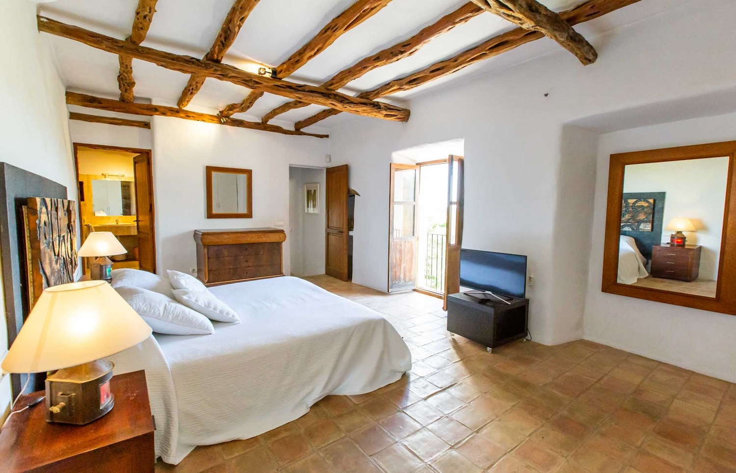 Im Einklang mit der umgebenden Landschaft sind die vier Schlafzimmer im Haupthaus in einer organischen Farbpalette und mit originellen Details gestaltet. Die Rezeption, das Wohnzimmer und die Küche mit ihrem charmanten Bauernhaus-Charakter sind mit Sabina-Balken und traditionellen Fliesenböden ausgestattet und schaffen einen kühlen, beruhigenden Raum zum Entspannen. Dann gibt es noch das Gästehaus mit 2 Zweibettzimmern.