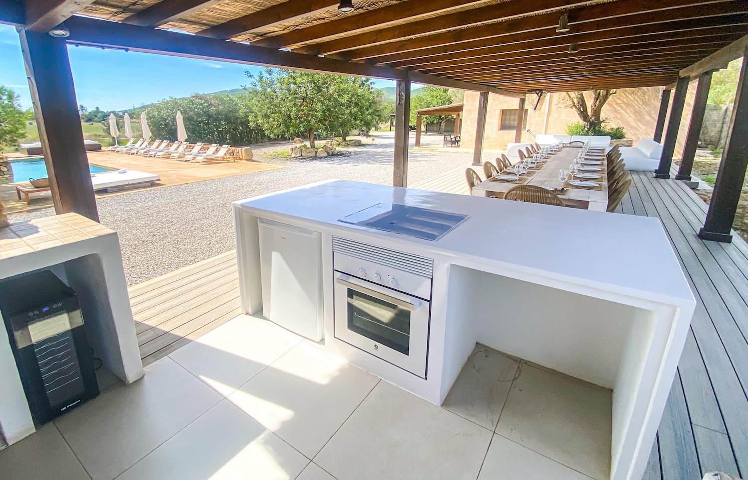 Can Sage bietet viel Platz für Unternehmungen im Freien, darunter einen Pavillon mit Grill, schattige Pergolen, mehrere Essbereiche und natürlich einen herrlichen Swimmingpool. Can Sage verfügt über einen bezaubernden Pavillon, einen Grillplatz und Essbereiche im Freien und eignet sich perfekt für den Empfang einer großen Familie oder einer Gruppe von Freunden. Umgeben von weitläufigen landwirtschaftlichen Flächen, bietet die Villa einen ungehinderten Blick auf die majestätische mittelalterliche Festung Dalt Villa.