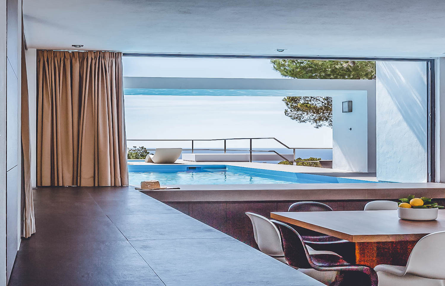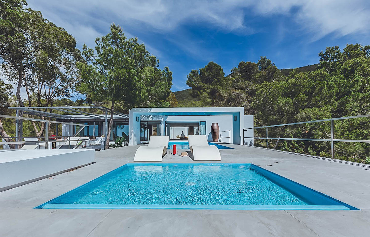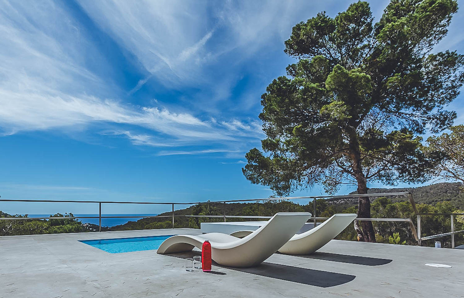 The terraces of Villa Aurora are equally stylish and offer unrivalled views over the coastline, stretching to Es Vedra, Formentera and beyond. From here you can enjoy the world famous Ibizan sunset as you relax, cocktail in hand, after another perfect day. The swimming pool is surrounded by designer sun loungers and several chillout areas provide shade and comfort. An outside dining area welcomes you through breakfast to supper under the stars. Villa Aurora is simply an idyllic Ibizan holiday home.