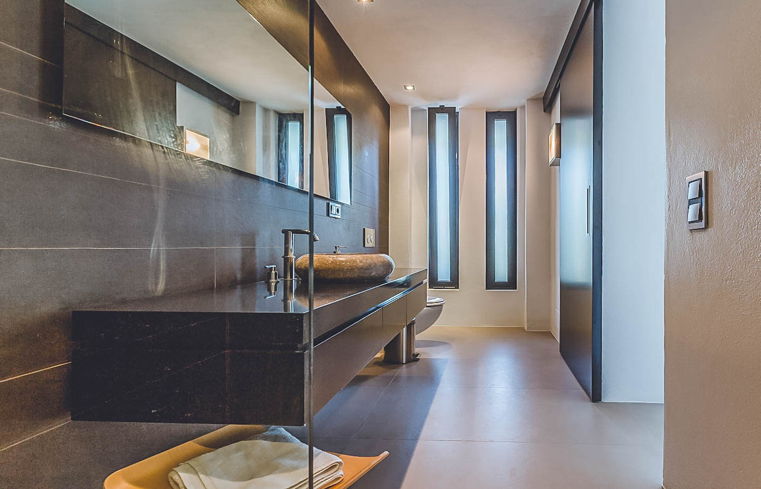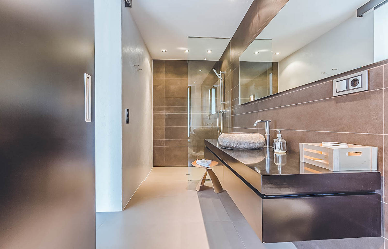 The interior of Villa Aurora is sleek and sophisticated, designed to perfection, with careful attention to detail making sure your every need is catered for as soon as you enter the property. A welcoming open plan lounge and dining area look out over the pool and across to the water, an idyllic spot to relax and revive your senses. The well appointed, modern and spacious kitchen has all the high tech appliances you would expect of a house of this calibre. Each of the 5 independent non connected bedrooms have their own unique style, and are all furnished to the highest standard, continuing the modern, minimalist theme throughout. All have double beds and en-suite bathrooms, with two out of the five benefiting from their own bathtub.